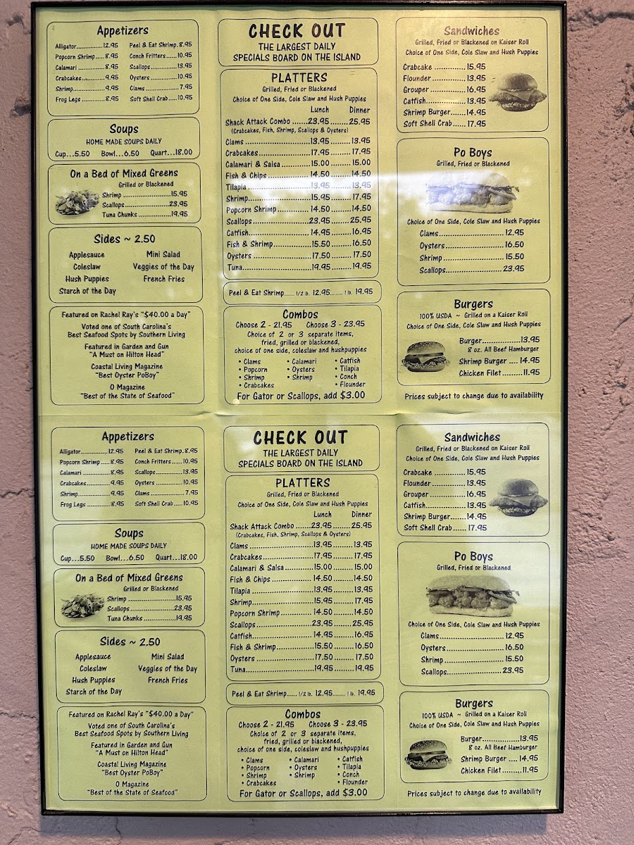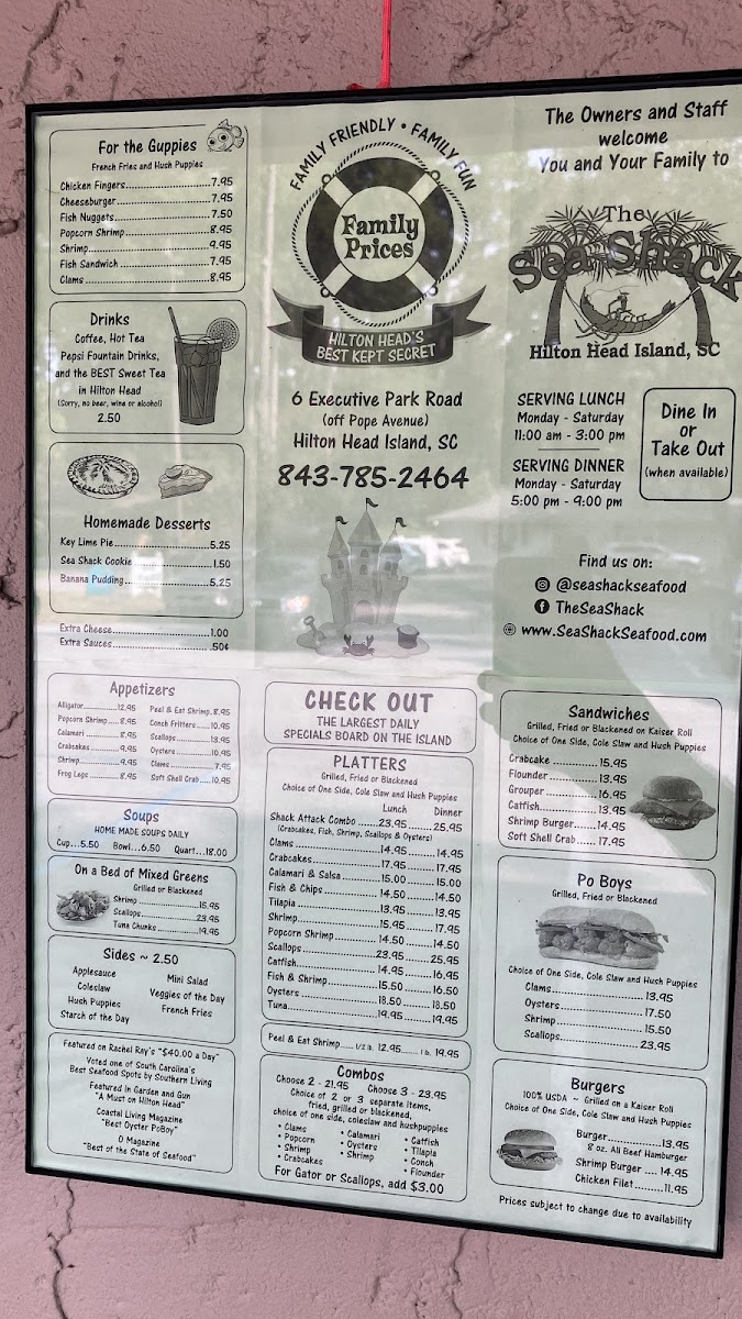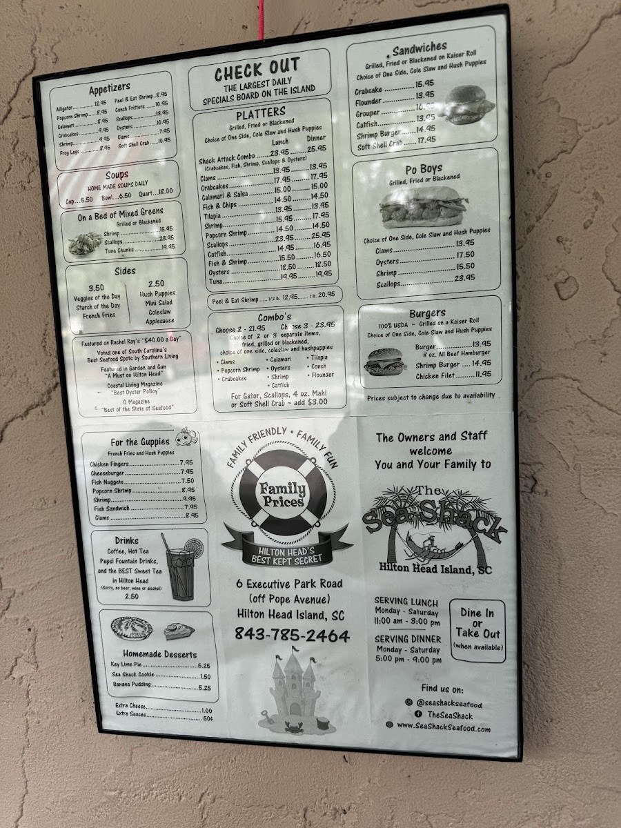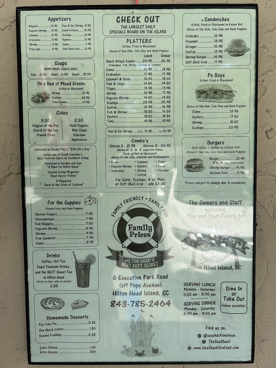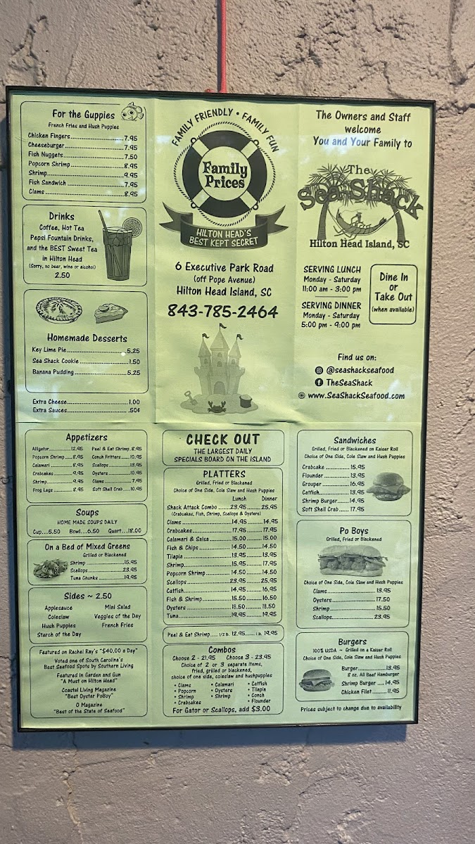 Welcome to the Sea Shack Menu, where every bite promises a taste of the freshest seafood, just steps away from the beautiful shores of Hilton Head Island. Nestled at 6 Executive Park Rd, Hilton Head Island, SC, this cozy gem is known for its laid-back atmosphere and vibrant flavors. The menu offers a variety of mouthwatering dishes, from classic seafood staples like crispy fried shrimp and tender oysters to more unique options like their signature fish tacos. Whether you’re in the mood for a hearty plate of blackened mahi-mahi or craving a fresh catch of the day, The Sea Shack has something to satisfy your every craving.